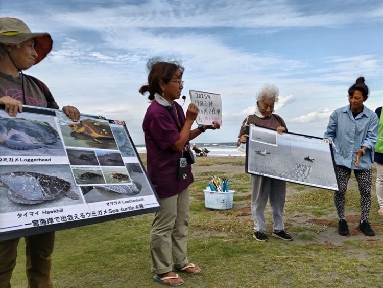 After lunch, we traveled by bus again to Tsurigasaki Beach. During the bus ride, a sign language workshop was conducted by a hearing-impaired employee, where participants learned basic greetings and other sign language. Upon arriving at Tsurigasaki Beach, members of the "Ichinomiya Sea Turtle Conservation Group" explained the beach and their organization's activities, and we conducted beach cleaning. Thanks to the daily efforts of local community members, the beach was maintained in beautiful condition. However, we were able to collected large fishing buoy that had washed ashore and small plastic fragments.