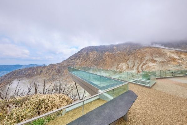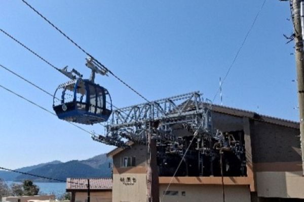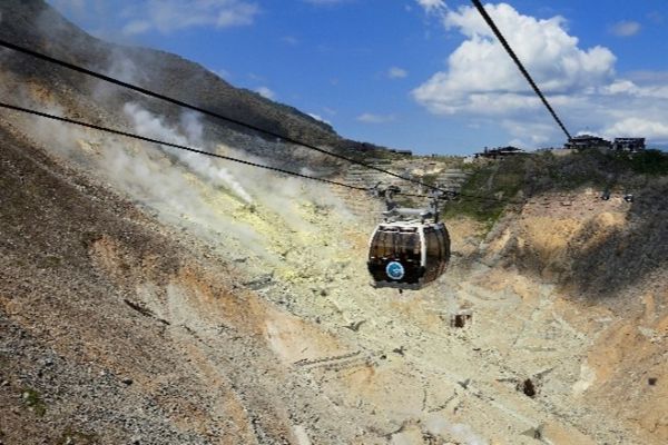 At Togendai Station, enjoy views of the passing Pirate Ships from the restaurant. From here, board the highly anticipated Hakone gondola, uniquely designed without windows. Experience a thrilling aerial journey as you admire the stunning mountain and valley landscapes of Hakone on your way to Owakudani.